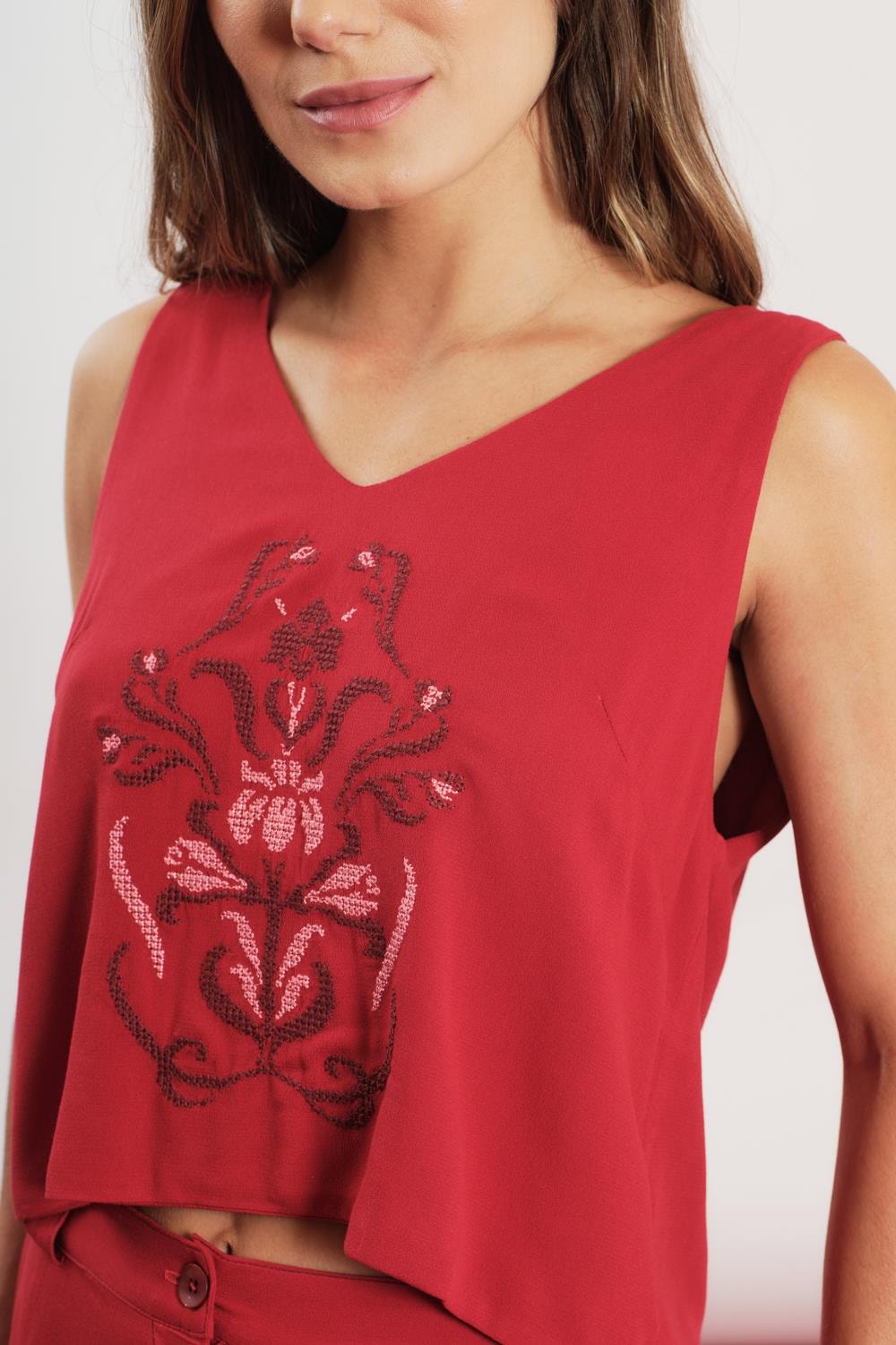 Blusa Decote v Bordado Liso